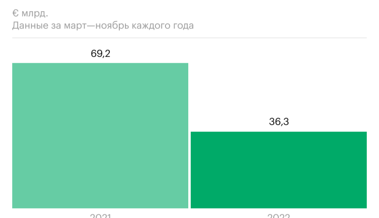 Экспорт товаров из стран Евросоюза в Россию за март—ноябрь 2022 года упал на 47%. Почти ровно на столько же (на 48%) вырос экспорт товаров из Европы в соседние с Россией страны. Как выглядит аномалия — в инфографике РБК.