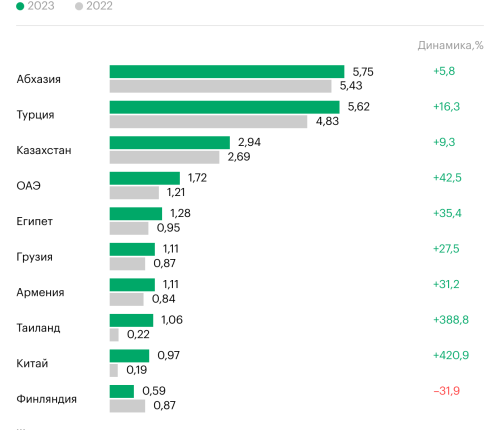 Из европейских стран в десятку попала только Финляндия— туда в 2023 году съездили 0,59 млн раз (против 0,87 млн в 2022 году).